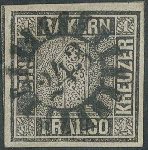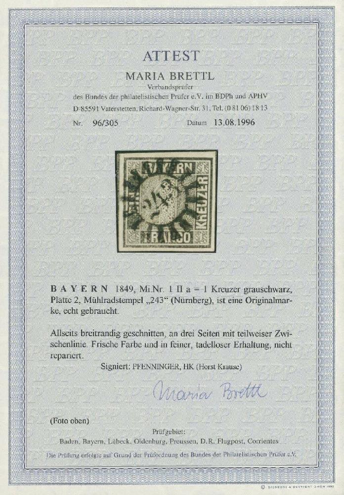 | Zusatzinformationen und Suchstichworte: | Ulrich Felzmann 179. Auktion 16. November 2023 Los 2052 Altdeutschland Bayern 1 Kreuzer grauschwarz, Platte 2, allseits breitrandig geschnitten, an drei Seiten mit teilweiser Zwischenlinie, mit Mühlradstempel "243" - NÜRNBERG, farbfrisches Kabinettstück, sign. Pfenninger mit Fotoattest, HK sowie Fotoattest Brettl BPP "Frische Farbe und in feiner, tadelloser Erhaltung.", € 3.500,- Ausruf 1.500,00 EUR |