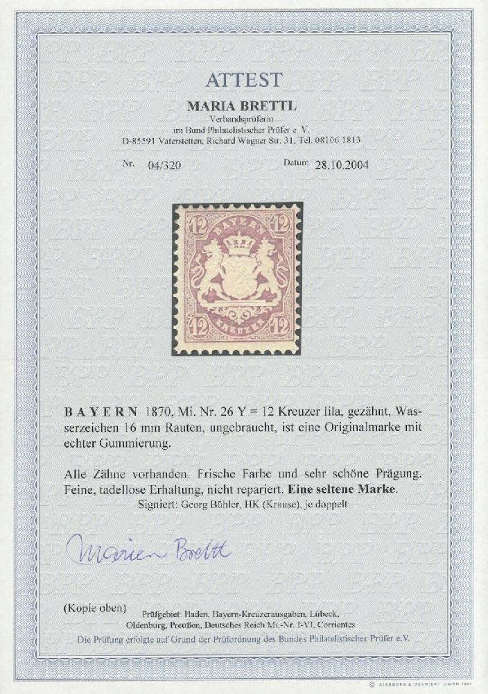 | Zusatzinformationen und Suchstichworte: | Ulrich Felzmann 179. Auktion 16. November 2023 Los 2091 Altdeutschland Bayern 12 Kreuzer lila "weite Rauten", vollzähniges und farbfrisches Kabinettstück, ungebraucht mit Originalgummierung, mehrfach signiert sowie Fotoattest Brettl BPP "Feine, tadellose Erhaltung. Eine seltene Marke.", € 1.600,- Ausruf 600,00 EUR |