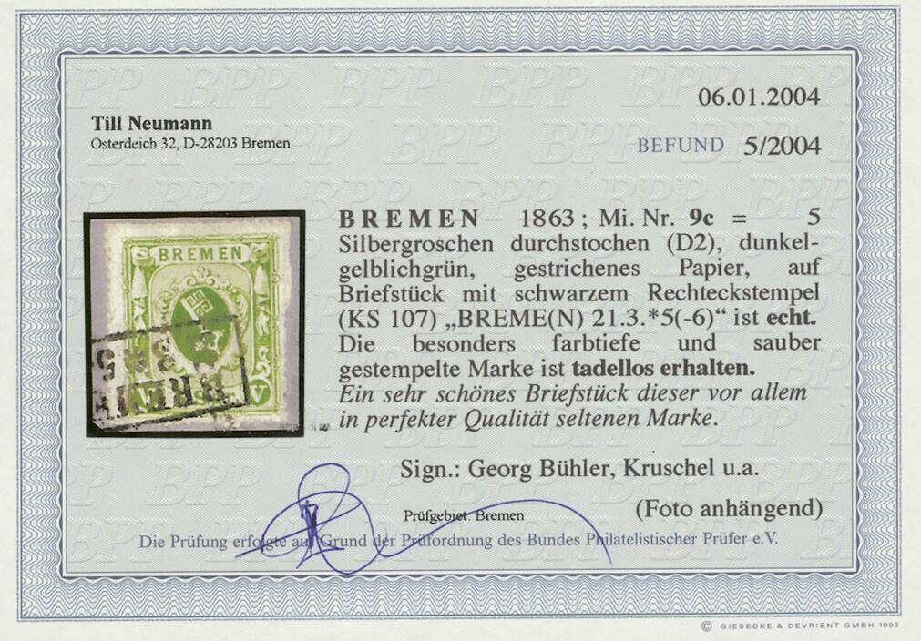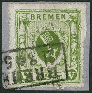 | Zusatzinformationen und Suchstichworte: | Ulrich Felzmann 179. Auktion 16. November 2023 Los 2138 Altdeutschland Bremen 5 Silbergroschen dunkelgelblichgrün durchstochen, farbfrisches und tadellos durchstochenes Kabinettstück mit Ra2 BREMEN 21.3 * 5(-6) auf Briefstück, u.a. sign. Kruschel sowie Fotobefund Neumann BPP "tadellos erhalten ... Ein sehr schönes Briefstück dieser vor allem in perfekter Qualität seltenen Marke.", € 600,- Ausruf 200,00 EUR |