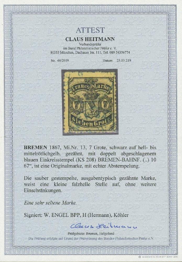 | Zusatzinformationen und Suchstichworte: | Ulrich Felzmann 179. Auktion 16. November 2023 Los 2139 Altdeutschland Bremen 7 Grote auf mittelrötlichgelb, ausgabentypisch gezähntes und farbfrisches Exemplar, entwertet mit blauem Einkreisstempel BREMEN BAHNHOF ... 10. 67 (KS208), abgesehen von einer kleinen falzhellen Stelle in tadelloser Erhaltung, Fotoatteste Dr. Fischer BPP (einwandfrei) und Heitmann BPP "... ohne weitere Einschränkungen. Eine sehr seltene Marke.", € 5.500,- Ausruf 500,00 EUR |
