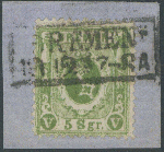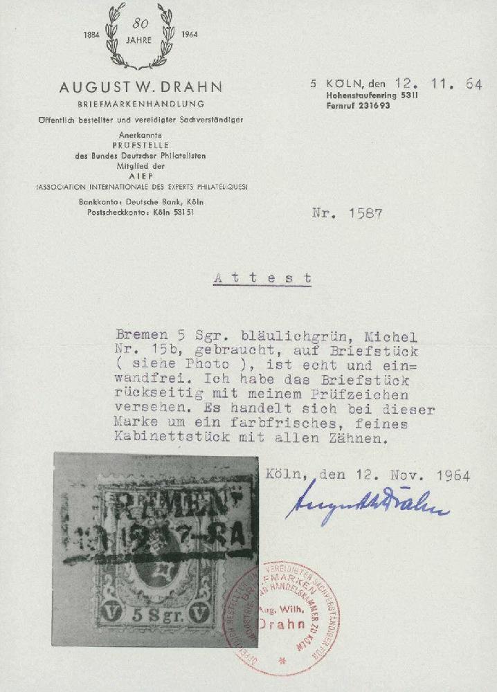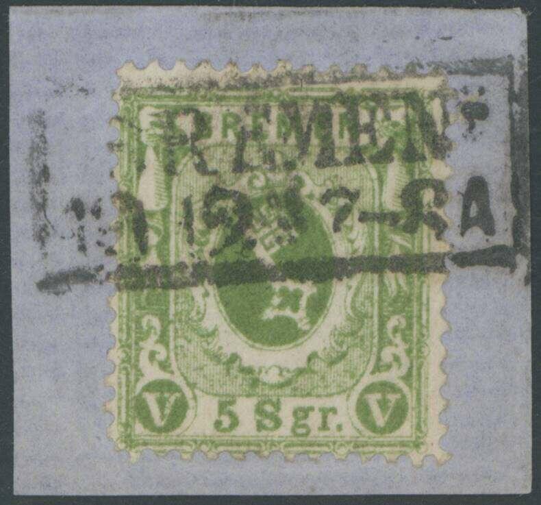 | Zusatzinformationen und Suchstichworte: | Ulrich Felzmann 179. Auktion 16. November 2023 Los 2140 Altdeutschland Bremen 5 Silbergroschen dunkelolivgrün, farbtypisches und sauber durchstochenes Kabinettstück, entwertet mit Ra2 BREMEN 19 12 *7-8A auf Briefstück, sign. sowie Fotoatteste Drahn, Dr. Fischer und Neumann BPP "... einwandfrei erhalten. Ein sehr schönes Briefstück dieser echt gestempelt extrem seltenen Marke und vor allem in dieser Qualität eine Rarität." - In dieser herausragenden Erhaltung eine der seltensten Altdeutschland-Marken, € 6.000,- Ausruf 5.000,00 EUR |
