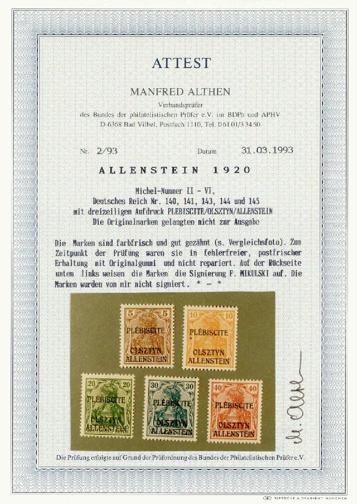 | Zusatzinformationen und Suchstichworte: | Veuskens 122. Auktion 30. November - 1. Dezember 2023 Los 2185 Allenstein Germania-Marken mit Aufdrucken 1920, zu den Wertstufen 5 Pf., 10 Pf., 20 Pf., 30 Pf. und 40 Pf., tadellos postfrisch, sig. Mikulski und Attest Althen BPP. M€ 1.000,- Ausruf 250,00 EUR |
