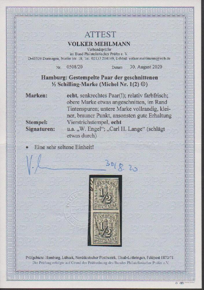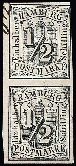 | Zusatzinformationen und Suchstichworte: | Rauhut & Kruschel - 221. Auktion 8. Dezember 2023 Los 528 Altdeutschland Hamburg 1/2 Sch. schwarz, senkrechtes gestempeltes Paar, obere Marke etwas berührt und kleine Tintenspur am Rand, untere gut (ein winziges Pünktchen belanglos). Senkrechte Paare der ersten Ausgabe sind deshalb selten, weil diese nicht am Postschalter (sondern nur waagerechte Einheiten) verkauft werden durften. Sign. W. Engel, C.H. Lange und Attest Mehlmann. Mi. mind. 5000,- Ausruf 700,00 EUR |