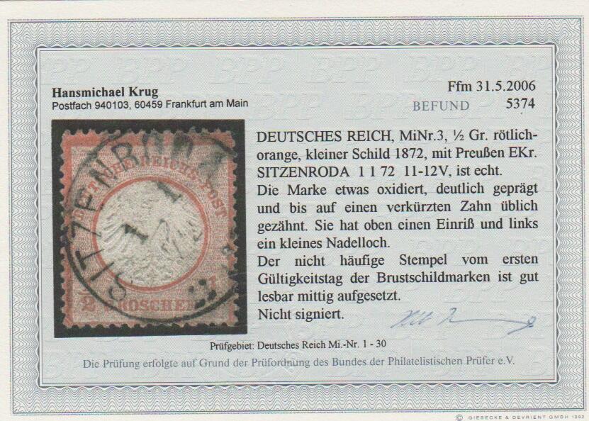 | Zusatzinformationen und Suchstichworte: | Rauhut & Kruschel - 221. Auktion 8. Dezember 2023 Los 2161 Deutsches Reich, 1872 Kleiner Brustschild 1/2 Gr. ziegelrot (kl. Mgl.) mit klarem Ersttags-K1 "Sitzenroda 1.1.72" Ausruf 80,00 EUR |