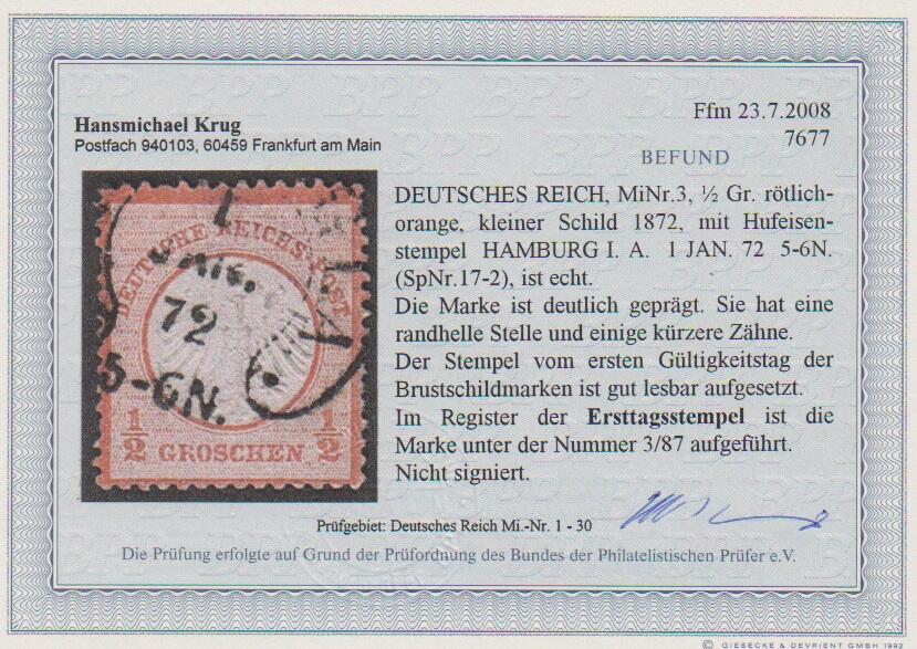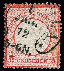 | Zusatzinformationen und Suchstichworte: | Rauhut & Kruschel - 221. Auktion 8. Dezember 2023 Los 2162 Deutsches Reich, 1872 Kleiner Brustschild 1/2 Gr. ziegelrot (min. Mängel wie randhell) mit klarem Hufeisen-Ersttagsstempel "Hamburg I.A. 1. Jan. 72" (selten!) Ausruf 140,00 EUR |