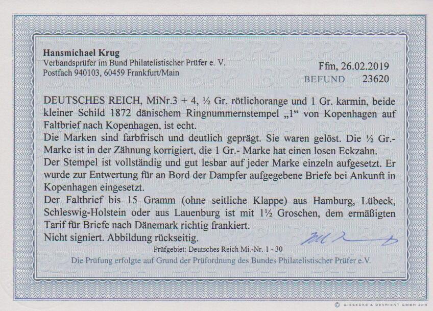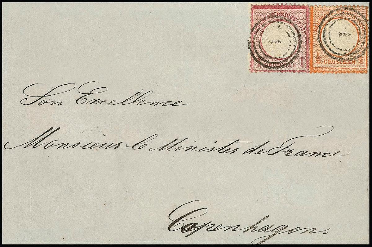 | Zusatzinformationen und Suchstichworte: | Rauhut & Kruschel - 221. Auktion 8. Dezember 2023 Los 2173 Deutsches Reich, 1872 Kleiner Brustschild 1/2 Gr. ziegelrot und 1 Gr. rosa auf Faltbrief (rs. ohne seitliche Klappe rechts) mit seltener Fremdentwertung durch dänischen NS "1" bei der Ankunft in Kopenhagen. Die Marken waren gelöst, 1/2 Gr. Zahnkorrekturen, 1 Gr. ein loser Eckzahn, optisch gut Ausruf 300,00 EUR |