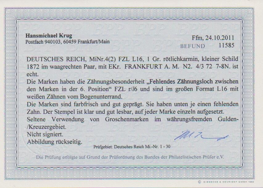 | Prüfer: | Krug, Hansmichael (BPP (Bund Philatelistischer Prüfer)) |