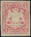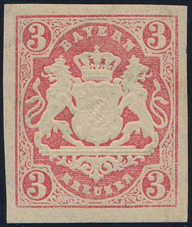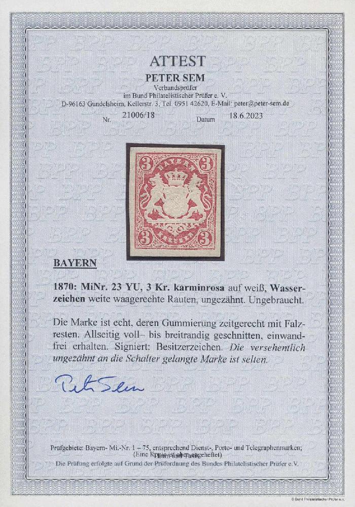 | Zusatzinformationen und Suchstichworte: | 82. HBA Auktion 9. - 11. November 2023 Los 25 Altdeutschland Bayern 1870, Wappen, 3 Kr., hellkarmin, Wasserzeichen weite Rauten, allseits voll- bis breitrandig ungezähnt, sauber ungebrauchtes Kabinettstück mit leichtem Falzrest, ungezähnte eine seltene Marke, Altsign. und gepr. Sem mit neuem Fotoattest, Mi. 2000,-- Zuschlag 640,00 EUR |