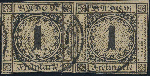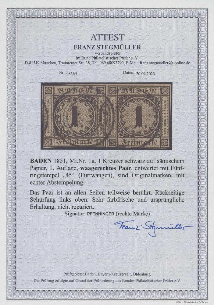 | Zusatzinformationen und Suchstichworte: | 82. HBA Auktion 9. - 11. November 2023 Los 1075 Altdeutschland Baden 1851, 1 Kr., schwarz a. mittelgraugelb, waagerechtes Paar, teils leicht berührt, teils vollrandig geschnitten, zweimal gestempelt mit Nummernstempel "45" von Furtwangen, die linke Marke ist oben ganz leicht geschürft, sonst saubere Prachterhaltung, gepr. Pfenninger mit Befund von 1960 und gepr. Stegmüller mit neuem Fotoattest, Mi. 2500,-- Ausruf 300,00 EUR |