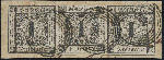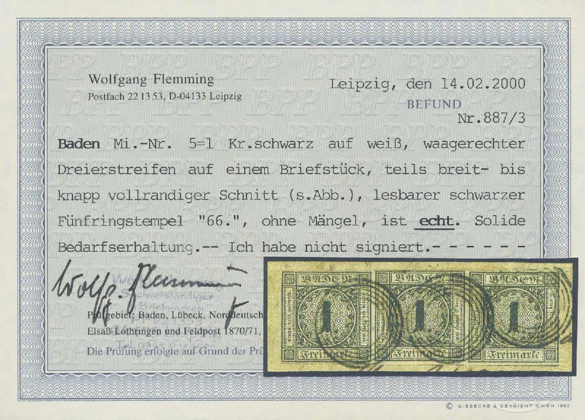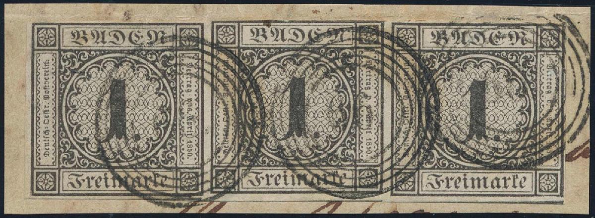 | Zusatzinformationen und Suchstichworte: | 82. HBA Auktion 9. - 11. November 2023 Los 1089 Altdeutschland Baden 1853, 1 Kr., schwarz a. weiß, waagerechter Dreierstreifen auf Briefstück, allseits knappvoll- bis breitrandig geschnitten, sauber dreimal mit Nummernstempel "66" von Jestetten entwertet, saubere Prachterhaltung, gepr. Flemming mit Fotobefund, Mi. 220,-- Ausruf 60,00 EUR |