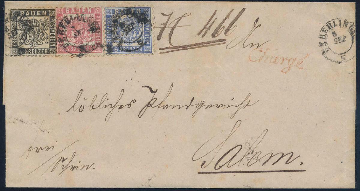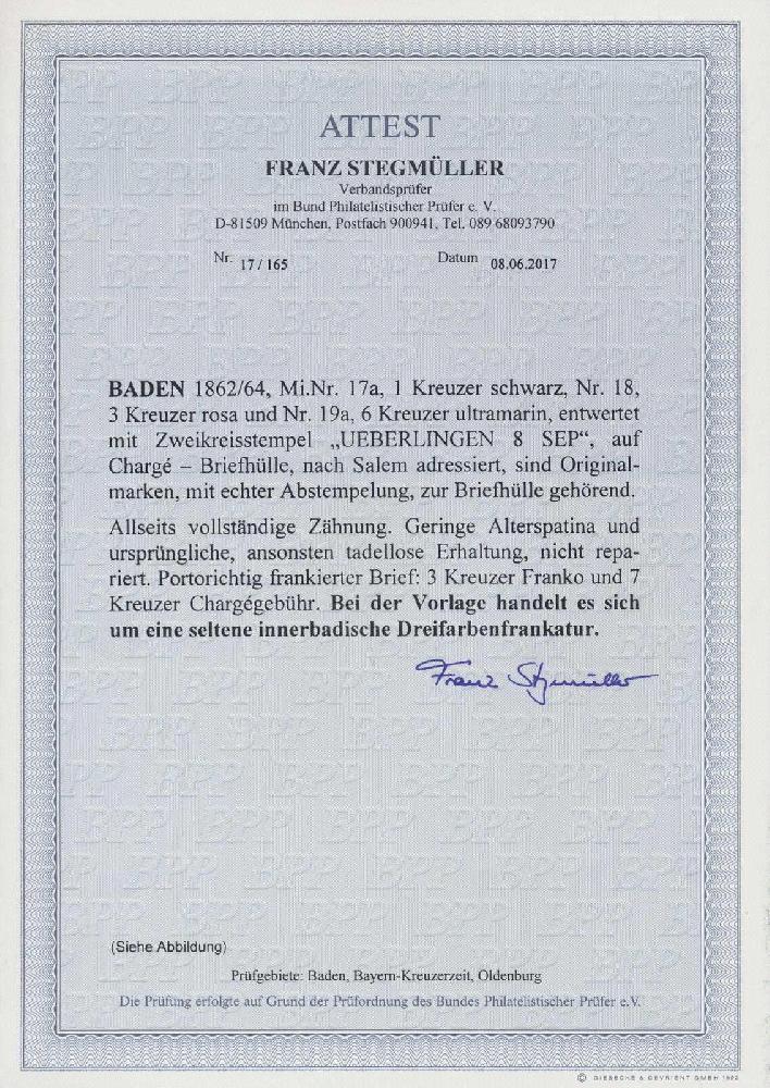 | Zusatzinformationen und Suchstichworte: | 82. HBA Auktion 9. - 11. November 2023 Los 1100 Altdeutschland Baden 1862/1864, 1 Kr., schwarz, in schöner Dreifarbenfrankatur mit 3 Kr., hellrot und 6 Kr., ultramarin, auf Chargé-Briefhülle von "UEBERLINGEN 8 SEP", adressiert nach Salem mit Durchgangsstempel und Ankunftsstempel, jede Marke einzeln gestempelt, eine minimale Alterspatina ist belanglos, sonst tadellose Kabinetterhaltung, laut Attest "eine seltene innerbadische Dreifarbenfrankatur", gepr. Stegmüller mit Fotoattest Zuschlag 360,00 EUR |