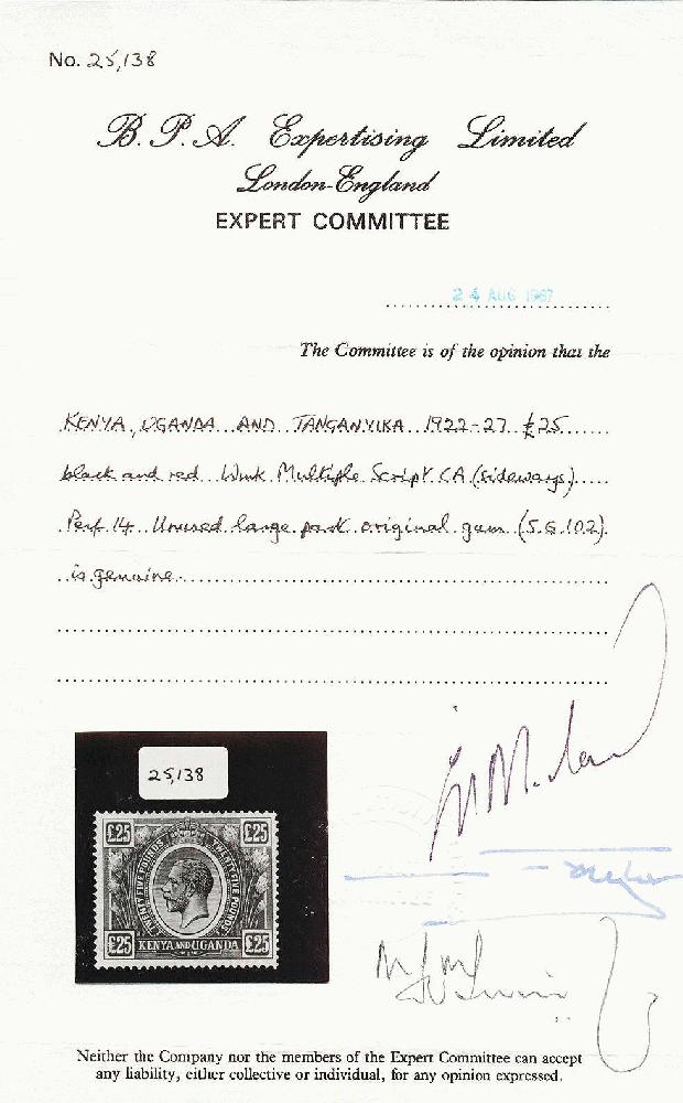 | Zusatzinformationen und Suchstichworte: | 21. classicphil GmbH Auktion 06.-07. Dezember 2023 Los 4297 Britisch Ostafrika und Uganda 1922-27, £ 25, schwarz und rot, Wasserzeichen mehrfach Schrift CA liegend, gezähnt 14, großer Teil Originalgummi, die dritt seltenste Marke dieses Satzes von denen die £ 75 ist die seltenste, tadellos zentriert/gleichermaßen das schönste bekannte Exemplar, ein äußerst attraktives Stück für den erlesenen Geschmack, Prüfungsbefund BPA, SUP! Schätzpreis 46,000 EUR Ausruf 34.000,00 EUR |