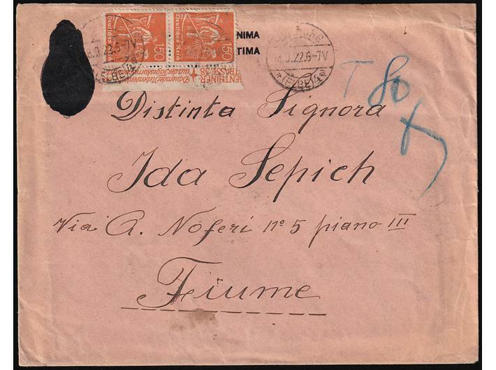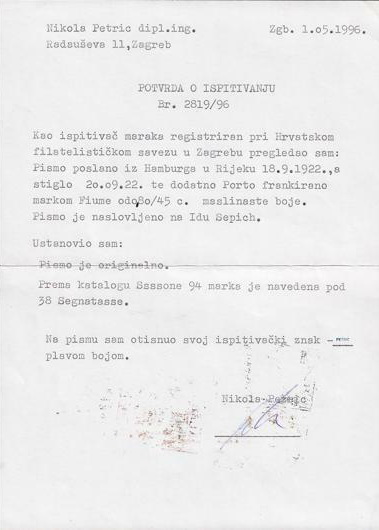 | Zusatzinformationen und Suchstichworte: | 66. Barac & Pervan Auktion 2. Dezember 2023 Los 162 Fiume Letter sent from Hamburg in Germany to Rijeka 18.09. 1922. On arrival it was ported with a provisional porto stamp 80 on 45 centi. Good quality, photo certificate Petric Ausruf 20,00 EUR |
