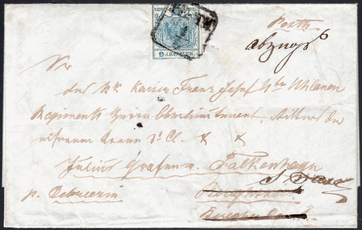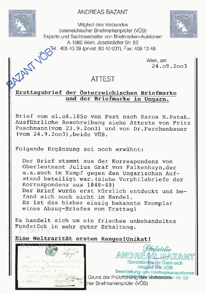 | Zusatzinformationen und Suchstichworte: | Merkurphila Weihnachtsauktion 9. Dezember 2023 Los 55 Österreich Ausgabe 1850 Österreich, 1850, Ungarn, PESTH, unikales Briefpaar aus selbiger Korrespondenz vom LETZTTAG der Vorphilatelie 31.5.1850 u. ERSTTAG der Briefmarkenzeit 1.6.1850! Beide Faltbriefe, mit vollem Inhalt aus innerfamiliärer FALKENHAYN - Korrespondenz (Franz v. Falkenhayn an Julius v. Falkenhayn) ursprünglich adressiert n. BEREGSZASZ und weitergeleitet n. SAROS NAGY PATOK. Auf Grund der Weiterleitung wurden beide Belege mit handschriftlichem Vermerk "ABZUGSB." versehen. Bei dem Portobrief vom 31.5.1850 war dieser Vermerk insofern korrekt und notwendig weil die mit Tinte angeschriebene Taxe "12" nicht in BEREGSZASZ einzuheben war, sondern in SAROS N. PATAK und weil der Brief von der ursprünglichen Route "abgezogen" wurde bzw. es bei der innerpostalischen Verrechnung Relevanz hatte. Bei dem mit 9Kr – portogerecht frankiertem Beleg vom 1.6.1850 war der Vermerk "ABZUGSB." nicht mehr erforderlich, weil der Brief ohnehin voll frankiert war und ohne Unterbrechung der Postroute mit selbem Tarif weitergeleitet werden konnte! Der Letzttagsbrief befindet sich in frischer, tadelloser und einwandfreier Prachterhaltung! Auch der Ersttagsbrief ist komplett und besonders frisch erhalten, die Nr 5 H I als Einzelfrankatur ist vorschriftsmäßig oben in der Mitte des sauber beschrifteten Faltbriefes geklebt! Die in mehreren Belangen interessante Type I, Magistris P 70 mit Plattenfehler in der Wertziffer und im K von Kreuzer ist links und rechts vollrandig, oben und unten entlang der Randlinie geschnitten! Dieses außergewöhnliche und einmalige Briefpaar, welches die postalische Abwicklung von Vorphilatelie und Markenzeit bestens dokumentiert zählt ohne Zweifel zu den Raritäten der österreichischen Klassik und der Postgeschichte vor und nach der Einführung von Briefmarken! Ausruf 13.000,00 EUR |