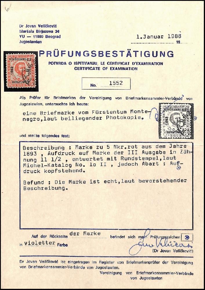 | Zusatzinformationen und Suchstichworte: | 56. SFK Auktion 28. - 29. Oktober 2023 Los 695 Montenegro 1893 kopfstehender Aufdruck auf Nov. 5. Fotoattesten Velickovic. Pracht Ausruf 35,00 EUR |