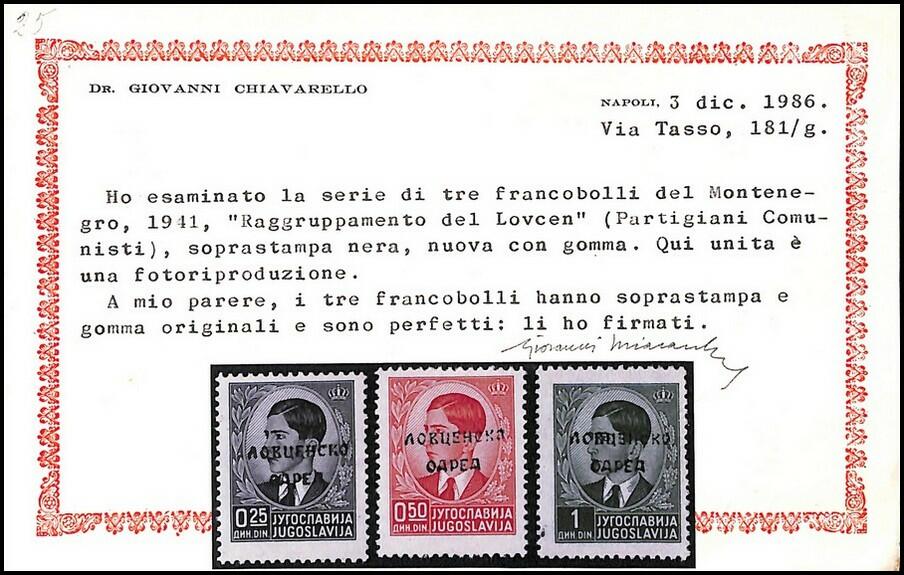 | Zusatzinformationen und Suchstichworte: | 56. SFK Auktion 28 Oktober 2023 Los 764 Montenegro 1941 Partisanen Lovcenski odred kompletter Satz mit 3 Werten mit Chiavarello Attest. Pracht Ausruf 95,00 EUR |