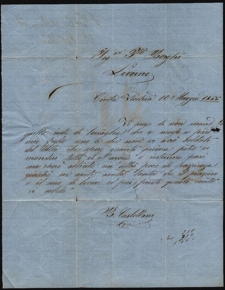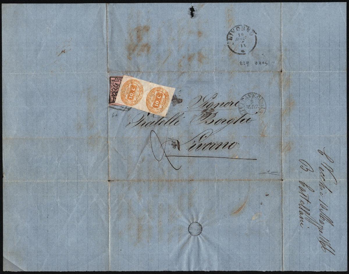| Zusatzinformationen und Suchstichworte: | Versuch einer Übersetzung: Kirchenstaat: Korrespondenz für das Königreich Italien Brief von Civitavecchia nach Livorno, frankiert bis zur päpstlichen Grenze mit 5 Bajocchi karminrosa, entwertet mit dem „stummen“ rautenförmigen Stempel und daneben dem Doppelkreis „CIVITAVECCHIA 9 MAG 66“ auf der Vorderseite. Bei der Ankunft in Livorno (Stempel auf der Rückseite vom 10. Mai) wurden 20 Cent für italienische Inlandsgebühren erhoben, sowohl handschriftlich „2“ als auch mit einem vertikalen Paar der gelben italienischen 10-Cent-Portomarke, die bei der Ankunft nicht entwertet wurde und die päpstlichen Marke teilweise verdeckt. Sassone Nr.6A/1 Brief mit Briefmarke, Portomarken, Entwertungen und Stempeln zeitgerecht. |