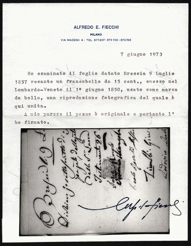 | Zusatzinformationen und Suchstichworte: | Versuch einer Übersetzung: Ich habe das Blatt vom 9. Juli 1857 aus Brescia untersucht, das eine 15-Cent-Briefmarke enthält, die am 1. Juni 1850 in Lombardo-Venetien herausgegeben und als Steuermarke verwendet wurde. Eine fotografische Reproduktion davon ist hier beigefügt. Meiner Meinung nach ist das Stück original und daher habe ich es signiert. |