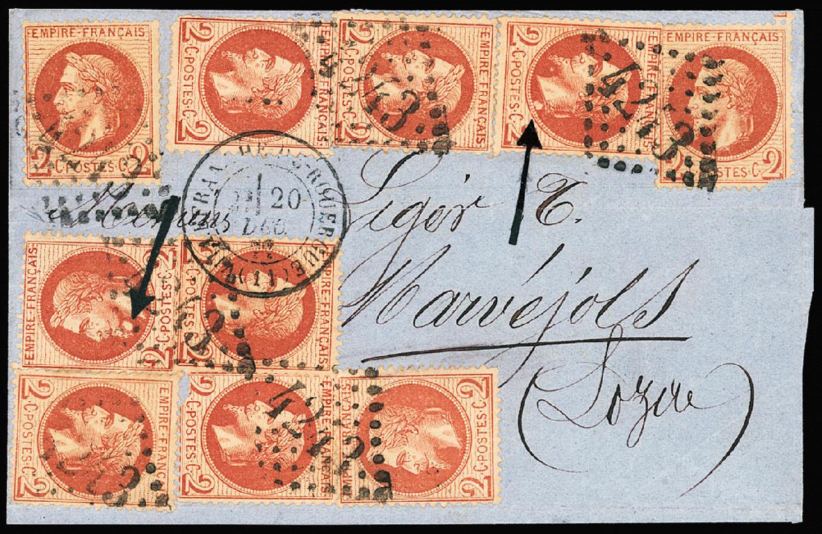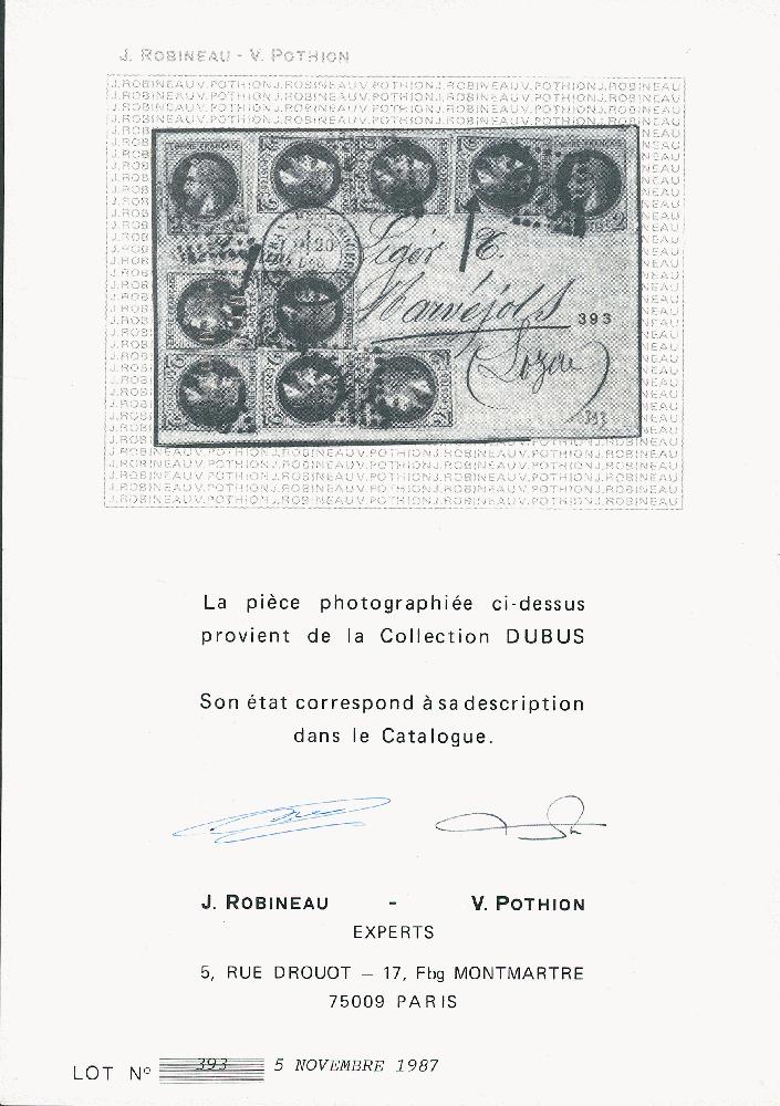 | Zusatzinformationen und Suchstichworte: | Le Timbre Classique Paris - 42. Fernauktion 24. Oktober 2023 Los 2721 Frankreich N°26, 2c brun rouge, 10 pièces, OBL GC 4243 + T17 Villefranche de Rouergue (1872), avec variétés boule sous le cou et boule sous le menton, ex. collection Dubus, certificat Robineau-Pothion. 2 ex. pd sinon TB et RR Ausruf 1.000,00 EUR |