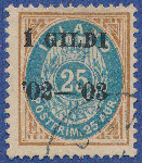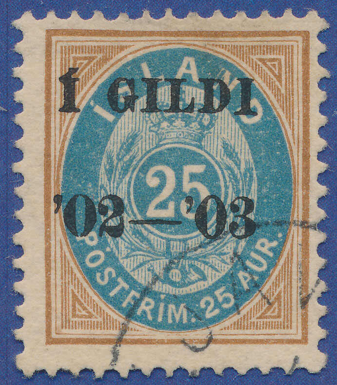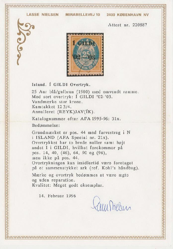 | Zusatzinformationen und Suchstichworte: | Postiljonen 239. Int. Briefmarken Auktion 26. - 29. September 2023 Los 984 Island I Gildi Ausgabe Unique 25 aur Cancelled Very fresh 25 aur yellow brown/blue perf. 12 3/4 cancelled to order with grotesque cds. "REYKJAVIK" (Facit type G1b). The basic stamp has prominent oval flaw: bisected letter "N" in "ISLAND", position 44 (Facit No. 29v^1. The overprint is type D (two wide zeroes) and it has long last "I" in "GILDI". The overprinting for the few known copies 25 aur black overprint are assumed to have taken place in late 1903 (see also special article in Facit 2013 by Ellis Glatt. Old signature: "T.T" (Max Thier, Berlin). Certs KPK and Lasse Nielsen. Checked by Ellis Glatt. GREAT RARITY Zuschlag 13.000,00 EUR |