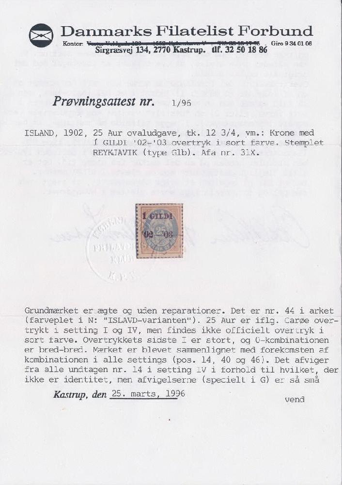 | Zusatzinformationen und Suchstichworte: | Postiljonen 239. Int. Briefmarken Auktion 26. - 29. September 2023 Los 984 Island I Gildi Ausgabe Unique 25 aur Cancelled Very fresh 25 aur yellow brown/blue perf. 12 3/4 cancelled to order with grotesque cds. "REYKJAVIK" (Facit type G1b). The basic stamp has prominent oval flaw: bisected letter "N" in "ISLAND", position 44 (Facit No. 29v^1. The overprint is type D (two wide zeroes) and it has long last "I" in "GILDI". The overprinting for the few known copies 25 aur black overprint are assumed to have taken place in late 1903 (see also special article in Facit 2013 by Ellis Glatt. Old signature: "T.T" (Max Thier, Berlin). GREAT RARITY Zuschlag 13.000,00 EUR |