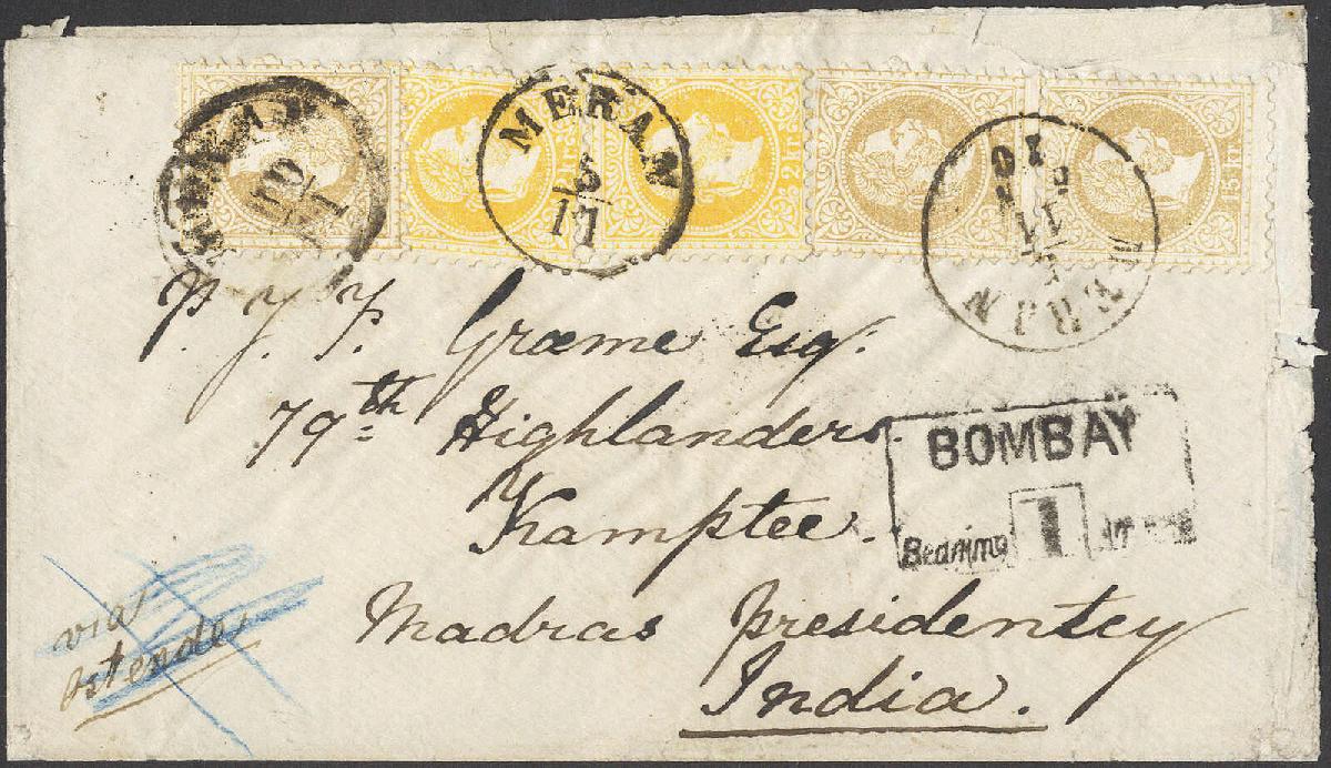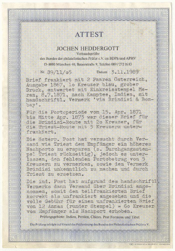 | Zusatzinformationen und Suchstichworte: | 73. Deider Auktion 25. November 2023 Los 1403 Österreich Post nach Indien1870, 2 Kr. orange im senkr. Paar eingemittet von 15 Kr. braun, senkr. Paar und Einzelstück auf äußerst dekorativem Briefcouvert von "MERAN" nach Kamptee/Indien über Bombay (teilweise Feuchtigkeitsspuren), ein besonders dekorativer Übersee-Beleg Ausruf 500,00 EUR |