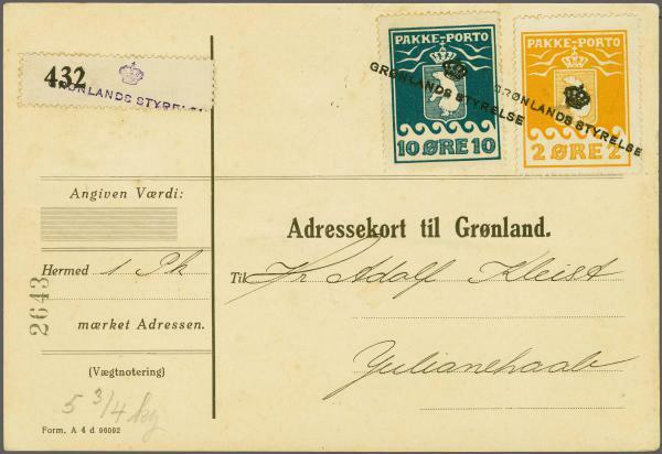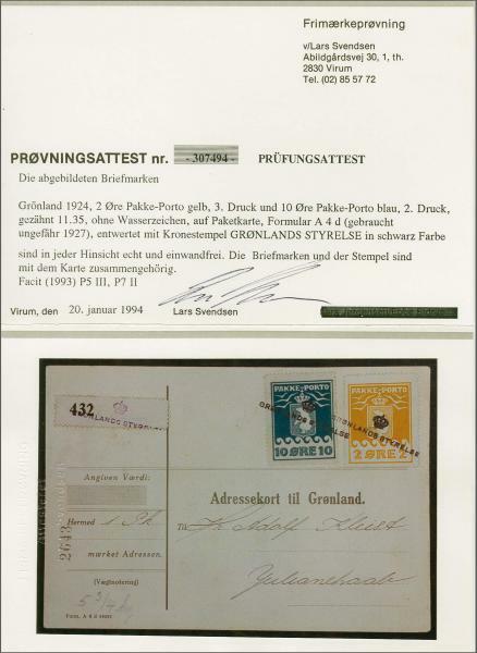 | Zusatzinformationen und Suchstichworte: | 309. - 320. Corinphila Auktion 24. November - 2. Dezember 2023 Los 1695 Dänemark Königliches Grönländisches Handelskontor 1927: 2 öre 3rd printing and 10 öre 2nd printing on parcel card, GF 09. Cancelled by black cachet with crown "GRÖNLANDS STYRELSE" (GF 15.02). Unknown vessel and departure from Copenhagen to Julianehaab. Excellent quality. Cert. Lars Svendsen Ausruf 200,00 CHF |