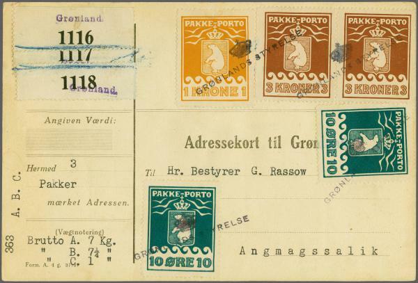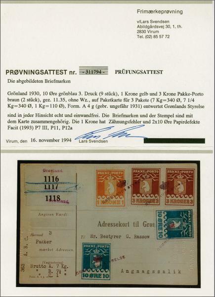 | Zusatzinformationen und Suchstichworte: | 309. - 320. Corinphila Auktion 24. November - 2. Dezember 2023 Los 1724 Dänemark Königliches Grönländisches Handelskontor 1931: 10 öre 3rd printing (four single stamps and a strip of five), 1 kr. yellow and pair 3 kr. brown, Thiele printings. Parcel card, GF 12. Cancelled with black 1-line cachet with crown "GRÖNLANDS STYRELSE" (GF 17.02). Conveyed by vessel "Gertrud Rask" from Copenhagen 09.07.1931 to Angmagssalik. Three stamps with small imperfections, still a very fine and rare card. Cert. Lars Svendsen Ausruf 350,00 CHF |