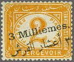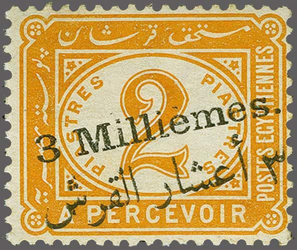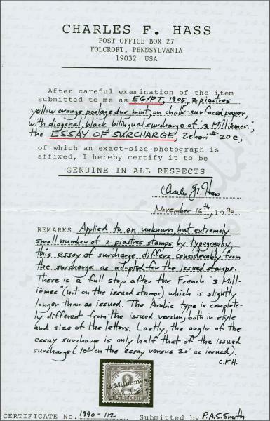 | Zusatzinformationen und Suchstichworte: | 309. - 320. Corinphila Auktion 24. November - 2. Dezember 2023 Los 5855 Ägypten (Königreich) 1905: Postage Due Essay for the surcharge "3 Millièmes." on 2 m. orange, an unused example showing the characteristic full stop after "Millièmes." and less angled black surcharge; fresh and fine, unmounted og. Signed Todd AIEP. Cert. Hass (1990) Nile Post E149 = $ 300 Ausruf 1.000,00 CHF |