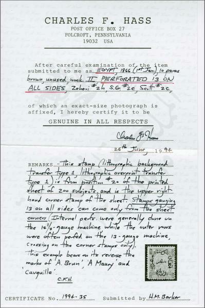 | Zusatzinformationen und Suchstichworte: | 309. - 320. Corinphila Auktion 24. November - 2. Dezember 2023 Los 5326 Ägypten (Königreich) First Issue 1866: 10 pa. brown, wmk. upright, perf. 13 at right all round (position 20), an unused example with this rare perforation variety - normally only ever genuinely found from a corner stamp of the sheet, fresh and very fine, unused without gum. Signed Brun, Maury, Todd. Cert. Hass (1994) Nile Post D2o = $ 220/Gi = £ 350 Ausruf 200,00 CHF |