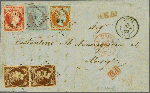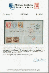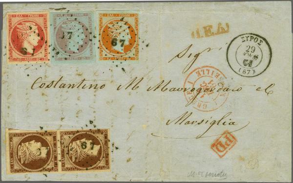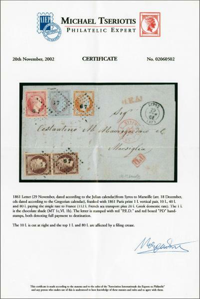 | Zusatzinformationen und Suchstichworte: | 309. - 320. Corinphila Auktion 24. November - 2. Dezember 2023 Los 7033 Griechenland 1861: 1 l. chocolate, Paris print, a used vertical pair with full to exceptional margins together with 10 l. orange on bluish, 40 l. mauve on blue and 80 l. rose, all with good to large margins except 10 l. just touch at lower right, on 1861 cover (Nov 29) to France, paying the 132 lepta single rate to France including the 20 lepta Greek inland rate. A stunning four colour franking despite faint filing crease through 80 l. and top 1 lepta. A most attractive and very rare franking of great visual appeal. Signed Hunziker. Cert. Tseriotis (2002) Ausruf 500,00 CHF |