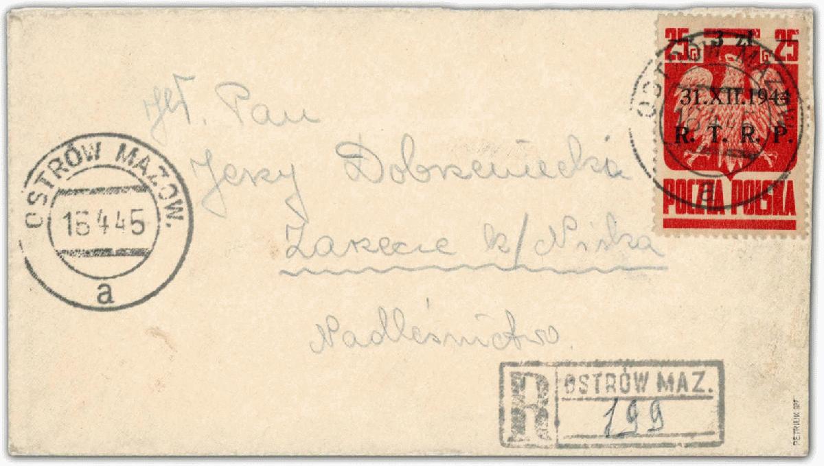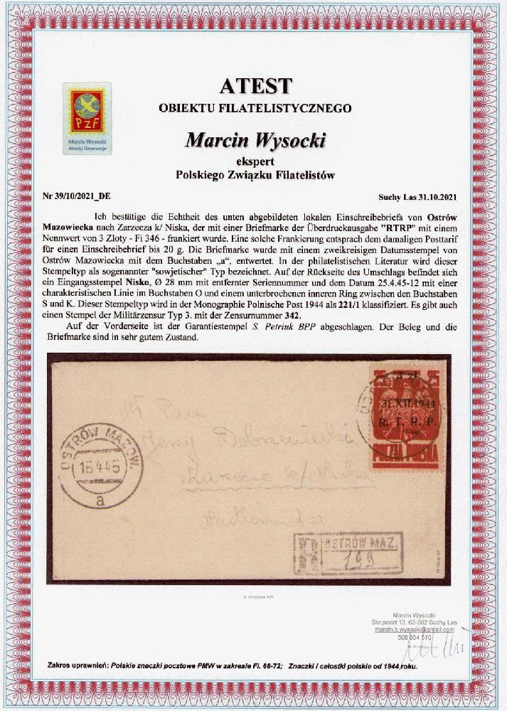 | Zusatzinformationen und Suchstichworte: | 33. Schlegel Auktionshaus Auktion 27. November 2023 Los 2110 Polen 1945, 3 Zt. auf 25 Gr. Staatswappen karmin, portogerechte Einzelfrankatur auf Einschreibbrief, aufgegeben "OSTROW MAZOW. 15.4.45", adressiert nach Nisko, rückseitig mit Zensur und Ankunftsstempel, Marke Eckbug, sonst gute Qualität Ausruf 400,00 EUR |