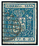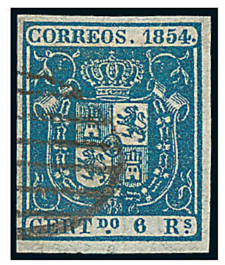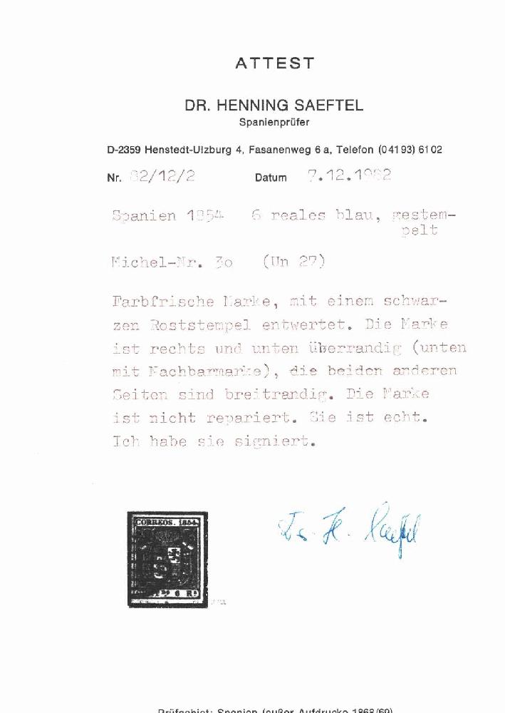 | Zusatzinformationen und Suchstichworte: | 115. Kirstein-Larisch Auktion 30. November - 02. Dezember 2023 Los 1875 Spanien 1854, 6 R. blau, farbfrisch u. alls. voll-/ breitrandig, sauber gest. Kab.- Stück, sign. Decker, gepr. mit Fotoattest Saeftel Ausruf 40,00 EUR |