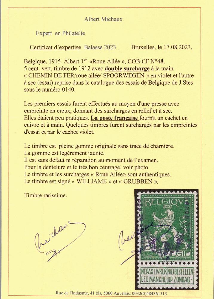 | Zusatzinformationen und Suchstichworte: | Baratoux Bordeaux - Philatelie und Postkarten 13. November 2023 Los 748 Belgien Belgique 1915 : CF nr 48 XX, pleine gomme originale et double surcharge , une violette et l'autre frappée à sec (essai de surcharge) , signé Williame et Grubben + certificat photo - GRANDE RARETE Ausruf 1.750,00 EUR |