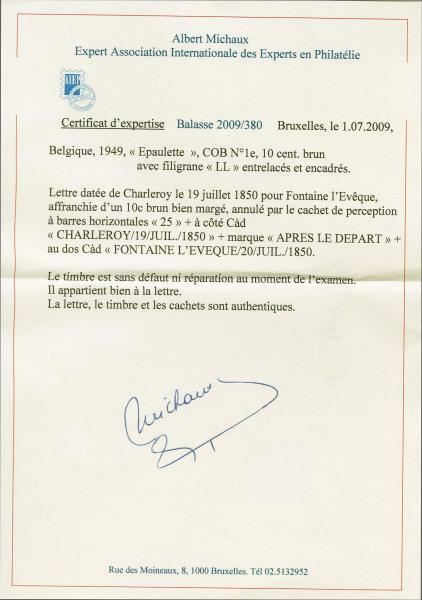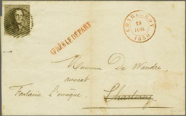 | Zusatzinformationen und Suchstichworte: | 309. - 320. Corinphila Auktion 24. November - 2. Dezember 2023 Los 7000 Belgien 1849: 10c. brown, good to wide margins, on 1850 cover from Chareleroi to Fontaine L'Eveque, neatly tied by numeral "25" barred obliterator in black. Straight line APRES LE DEPART cachet on the front and double circle Fontaine L'Eveque (July 20) arrival on reverse. Signed Williame. Cert. Michaux (2009) Ausruf 120,00 CHF |