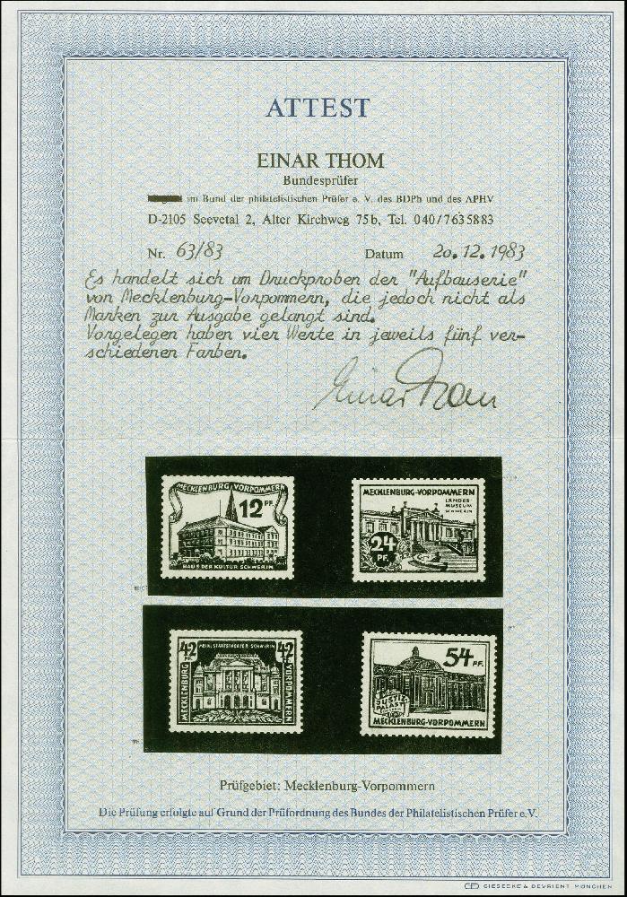 | Zusatzinformationen und Suchstichworte: | Heinrich Köhler 382. Auktion 18. - 23. September 2023 Los 2828 SBZ Mecklenburg Vorpommern 1946, Aufbauserie, gezähnte Essais 12-54 Pfg. (4 Werte in verschiedenen Zeichnungen), je in 5 verschiedenen Farben, auf schwarzen Karton geklebt, tadellos. Sehr selten. Fotoattest Thom BPP (1983) Zuschlag 1.600,00 EUR |