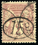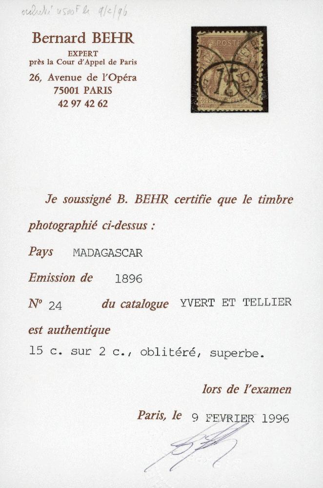 | Zusatzinformationen und Suchstichworte: | David Feldman S.A. - Alle Welt 23. November - 9. Dezember 2023 Los 613 Madagaskar 1896, Type Sage, Y&T n°24 O surcharge ellipse 15c sur 2 centimes lilas-brun /paille, belle oblitération Trésor et Postes aux Armées à cheval, cote Y&T 1'500€, signé A. Brun, Calves et Marquelet, certificat Behr, TB Ausruf 300,00 EUR |