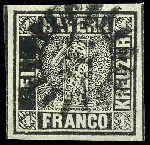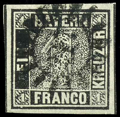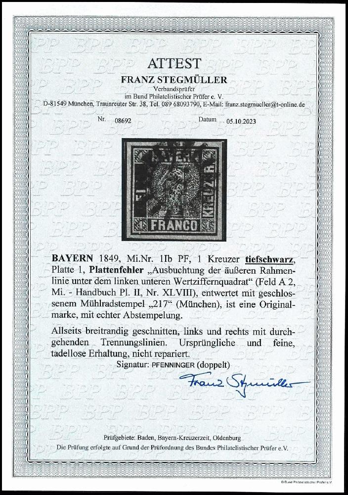 | Zusatzinformationen und Suchstichworte: | Dr. Reinhard Fischer 195. Auktion 1. Dezember 2023 Los 29 Altdeutschland Bayern 1 Kreuzer tiefschwarz, Platte 1, Plattenfehler XLVIII "Ausbuchtung der äußeren Rahmenlinie unter dem linken unteren Wertziffernquadrat" (Feld A2), farbfrisches und breitrandiges - links und rechts mit durchgehenden Trennungslinien - Kabinettstück, entwertet mit geschlossenem Mühlradstempel "217" - München, signiert Pfenninger (doppelt) und Fotoattest Franz Stegmüller BPP (2023) "Ursprüngliche und feine, tadellose Erhaltung." - TOP-Stück dieser prominenten Marke mit sehr dekorativer Abart! Ausruf 2.500,00 EUR |