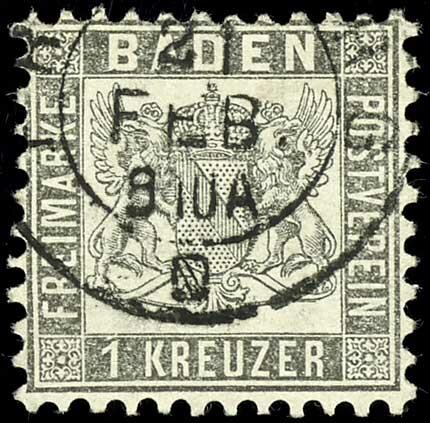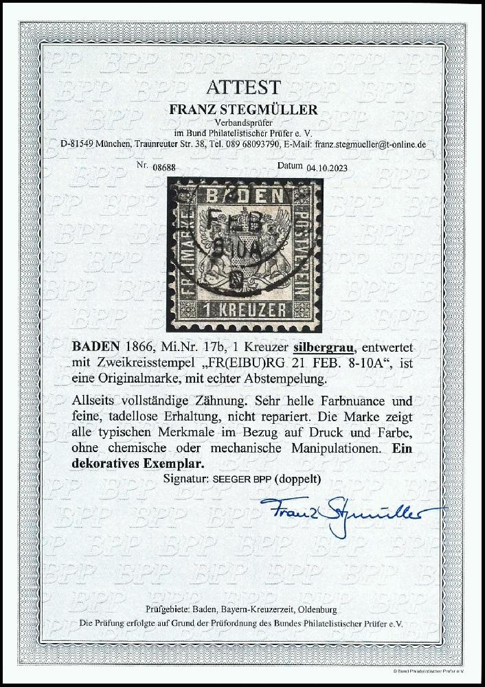 | Zusatzinformationen und Suchstichworte: | Dr. Reinhard Fischer 195. Auktion 1. Dezember 2023 Los 20 Altdeutschland Baden 1 Kreuzer silbergrau, vollzähniges und farbfrisches Kabinettstück, entwertet mit Zweikreisstempel "FREIBURG 21 FEB. 8-10A", sign. Seeger BPP (doppelte Signatur), Fotoattest Franz Stegmüller BPP (2023) "... feine, tadellose Erhaltung. Ein dekoratives Exemplar.", Mi. 3.000.- - in dieser Qualität ist die ohnehin seltene Marke eine Rarität des Sammelgebietes! Ausruf 1.000,00 EUR |