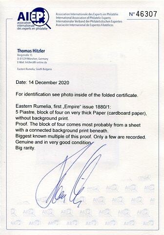 | Zusatzinformationen und Suchstichworte: | Balkanphila - Webshop 2019 NEU Los 14488 Türkei Eastern Roumelia: 1881 issue 5pi red without second colour thick paper imperforate proof. Largest recorded multiple with 2020 Thomas Hitzler certificate. (B16023) Festpreis 1.250,00 GBP |
