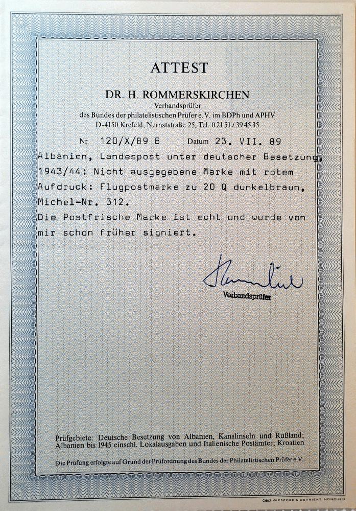 | Zusatzinformationen und Suchstichworte: | Austrophil - 181. Briefmarkenauktion 19. Oktober 2023 Los 372 Deutsche Besetzung II. WK Albanien 1943 Flugpostmarke Albaniens 20 Q. mit rotem Aufdruck "14 Shtator 1943" 1943 nicht ausgegeben. RR!, Attest Dr. ROMMERSKIRCHEN BPP Zuschlag 400,00 EUR |