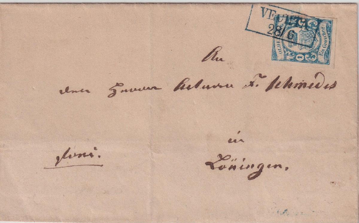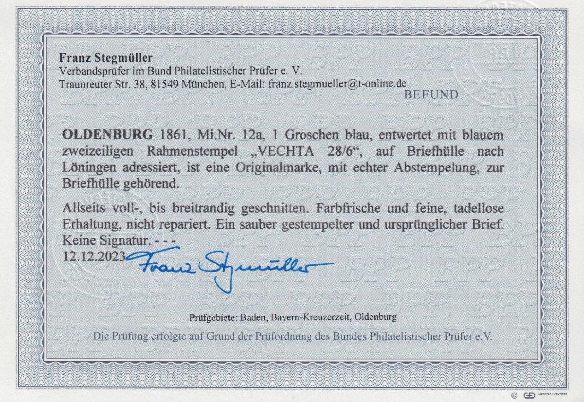 | Zusatzinformationen und Suchstichworte: | Südphila P. Feuser 101. Auktion 16. März 2024 Los 1120 Altdeutschland Oldenburg 1 Gr. blau, voll- bis breitrandig mit R2 VECHTA auf Kabinettbrief nach Löningen Ausruf 150,00 EUR |
