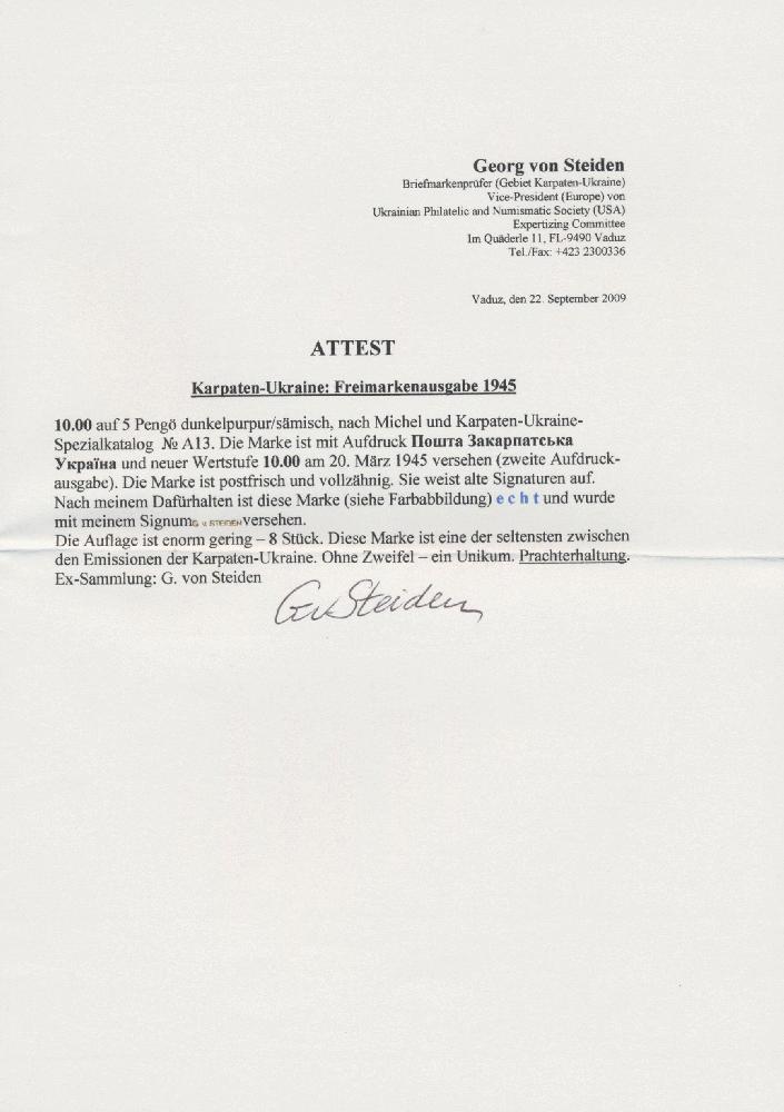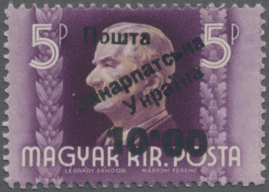| Zusatzinformationen und Suchstichworte: | Christoph Gärtner 57. Auktion 16. - 20. Oktober 2023 Los 3560A D Karpaten Ukraine 1945,10,00 auf 5p, postfrisch, gerade 8 Exemplaren verzeichnet Ausruf 1.000,00 EUR |