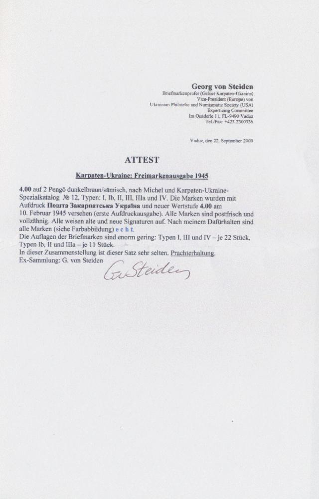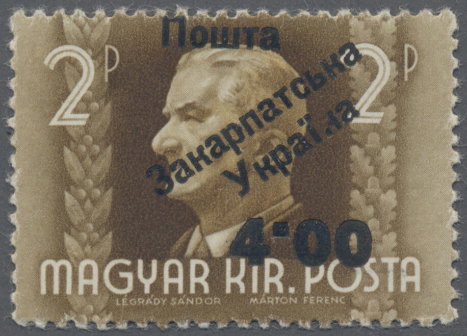 | Zusatzinformationen und Suchstichworte: | Christoph Gärtner 57. Auktion 16. - 20. Oktober 2023 Los 3551 D Karpaten Ukraine 1945,4,00 auf 2 p., type Ib, postfrisch. Signiert Bulat. Eine seltene Marke. Gerade 11 Exemplaren gemeldet derartig. Ausruf 300,00 EUR |