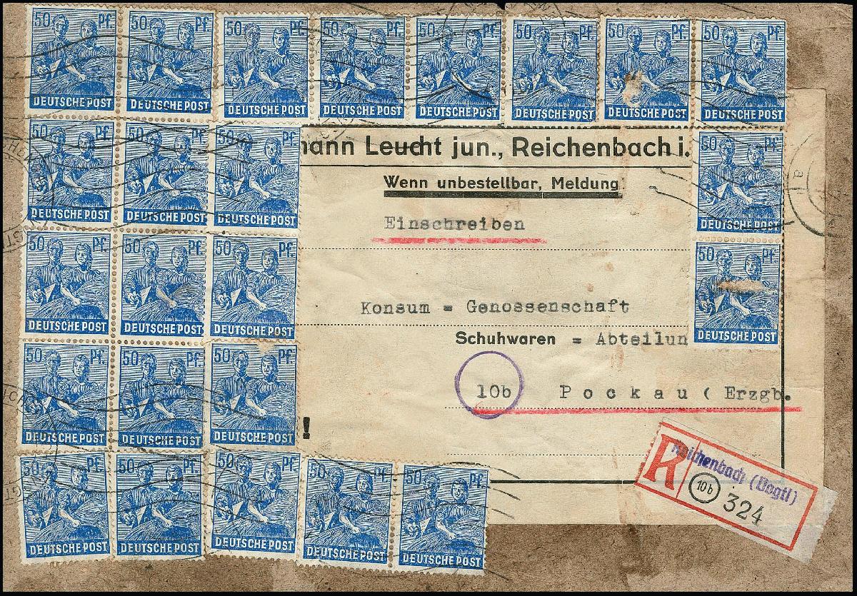 | Zusatzinformationen und Suchstichworte: | Rauhut & Kruschel - 221. Auktion 8. Dezember 2023 Los 3089 Gemeinschaftsausgaben 50 Pfg. per 24 als seltene hohe Zehnfach-Mehrfach-Frankatur Ost auf Adressteil einer eingeschriebenen Warenprobe der 3. Gewichtsstufe aus Reichenbach/Vogtl., 26.6.48, kl. Gebrauchsmgl. Ausruf 160,00 EUR |