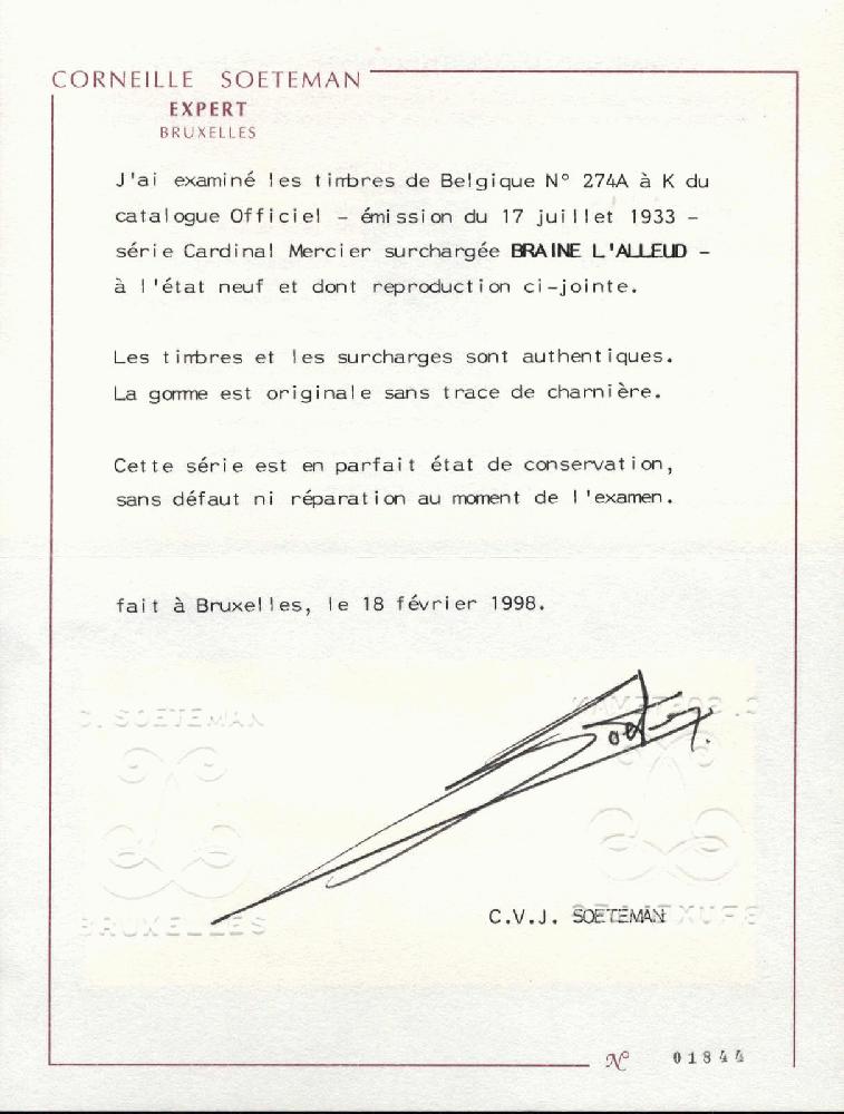 | Zusatzinformationen und Suchstichworte: | Viennafil 83. Live-Auktion 21. - 23. November 2023 Los 1605 Belgien 1933, Kardinal Dèsirè Mercier, komplette Serie 9 Werte mit Handstempel Aufdruck, postfrisch mit Originalgummi, Attest Soeteman, Mi. 333-341 I / 4400,- Zuschlag 1.200,00 EUR |