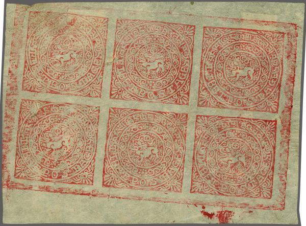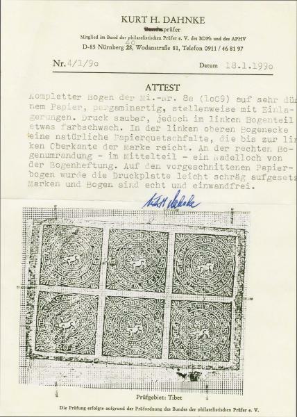 | Zusatzinformationen und Suchstichworte: | 309. - 320. Corinphila Auktion 24. November - 2. Dezember 2023 Los 3475 Tibet 1920: 8 Tanka (Tranka), complete sheet of 6 on very thin pegamine-like paper, clean print, which is somewhat meagre one the left half part. The paper contains some natural inclusions and has also a natural accordion fold to the upper left corner. There is a normal pinwhole in the right margin, that originates from previous stapling of sheets. The print is printed slightly obliquely. According to Kurt H. Dahnke 'genuine and flawless'. Certificate Dahnke 1990. Mi €6600.-+ Ausruf 1.000,00 CHF |