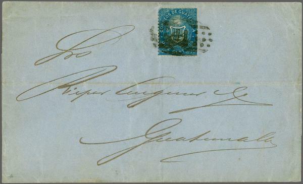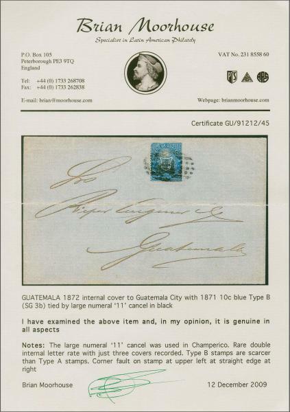 | Zusatzinformationen und Suchstichworte: | 309. - 320. Corinphila Auktion 24. November - 2. Dezember 2023 Los 704 Guatemala 1871: 10 c. blue, type B, used on 1872 cover, from Champerico to Guatemala City, tied by large "11" numeral in black, fault top corner and perfs. trimmed right side, however a rare usage, the type B being less common than type A and there are only three recorded double internal letter rate covers known Ausruf 800,00 CHF |