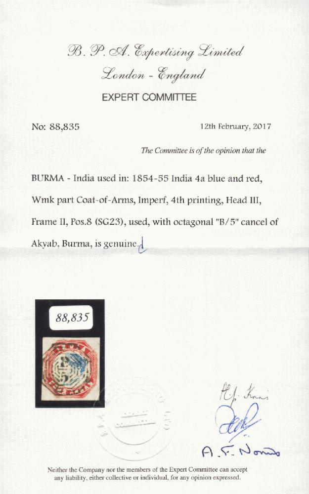 | Zusatzinformationen und Suchstichworte: | 21. classicphil GmbH Auktion 06.-07. Dezember 2023 Los 4313 Birma 1854-55,4a, blau und rot, Inder Briefmarke gebraucht in Burma, Wasserzeichen Teil vom Wappen, ungezähnt, 4. Druck, Kopf III, Rahmen II, Position. 8, gebraucht mit Oktogonalstempel B/5 von AKYAB/Burma, sehr gut gerandet, Prüfungsbefund BPA, frisch und gesucht, VF-XF! Schätzpreis 4,000 EUR Ausruf 1.200,00 EUR |