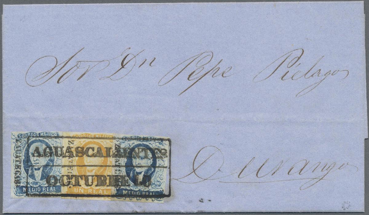 | Zusatzinformationen und Suchstichworte: | Christoph Gärtner 57. Auktion 16. - 20. Oktober 2023 Los 3026 D Mexiko 1857 ca. : Faltbriefhülle und vollständiger Brief zu Durango, mit Brief von Aquascalientes freigemacht durch erste Ausgabe zwei Einzelmarken von ½r. Blau plus 1 r. orange alle mit Landkreis Aufdruck "ZACATECAS" und entwertet mit Rahmen "AQUASCALIENTES/OCTUBRE 10" (signiert Roumet, Paris), und Faltbriefhülle frankiert mit ein Viertel von 8 r. rotlila entwertet Kasten "ZACATECAS/AGOSTO 27" Datumstempel (signiert "G. Lamy" und "Calves", und Mexiko EPSI Attest) Zuschlag 370,00 EUR |